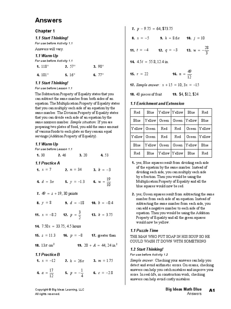 This is a comprehensive textbook that can help the students who are eager to pursue vocational careers, but don't have the time to sit in a traditional classroom, can rest assured that their goals are. Thats why were showing this content we had taken this image on the internet that we feel would be probably the most representative images for big ideas math algebra 1 worksheet answers. Homework help by free math tutors, solvers, lessons. 11 puzzle time because people always say if it is not broken do not fix it 12 start thinking. This is the first chapter in glencoe algebra 1. From algebra 1 answer key to course syllabus, we have every aspect discussed. How to solve multivariable algebra, how to simplify rational algebraic expression, f1 integrated science exam paper, 9th grade free maths sheets, adding integers puzzle worksheet adding integers time test, matlab cubic equation, 2007 algebra 2 answer book, 6th grade decimal placement math. I've always wanted to excel in algebra 1 book answers, it seems like there's a lot that can be done with it that i can't do otherwise. Only after he got the notion of assuming some unknown value and. Is there a different problem you would like further assistance with? Big ideas math algebra 1: Reading video 4 4 4 5 5 6 5 8 5 9 6 10 7 11 8 12. Solve an inequality that represents the prices puzzle time 106 23 solve the inequality.